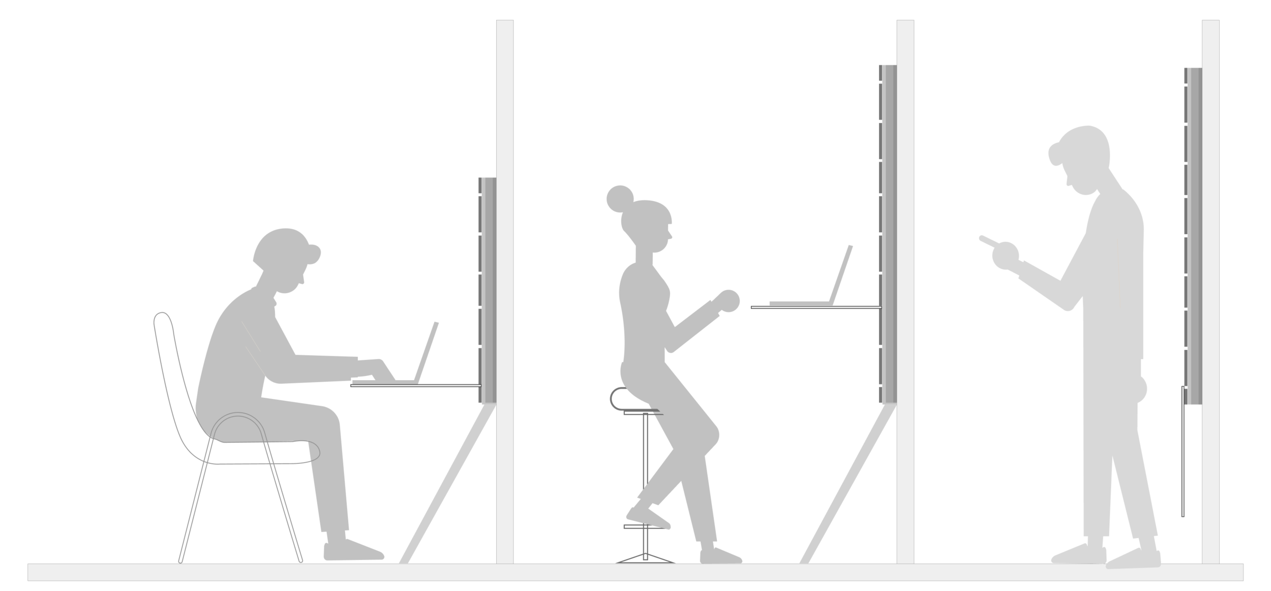 The vertical form factor also proved useful for easily supporting multiple work styles - between sitting, standing, and sharing. The built-in feature to “fold away” surfaces also helps greatly in aiding the minimal footprint.